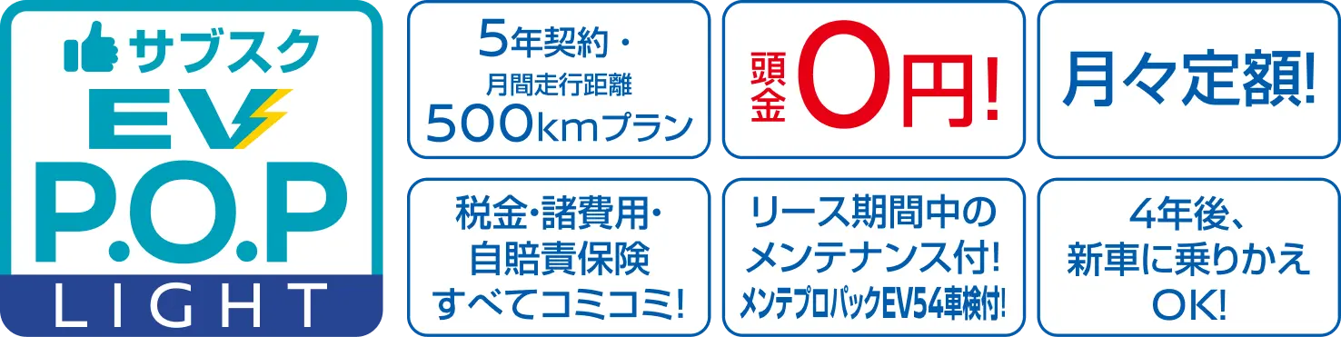 ①電気自動車のリース契約期間は60ヶ月です。各種補助金の支給要件に48ヶ月以上の使用義務が有るため、新車乗りかえも48ヶ月目以降から可能となります。②乗りかえ時に車両が契約走行距離未満でもキャッシュバックはありません。③リース料金は東京都登録の場合における自動車税免除(登録者の場合)を反映しております。他県登録の場合はリース料が異なります。「EVP.O.P補助金後払いプラン」をお選びの場合、初回お支払い分から補助金相当額を契約月数で均等に分割しリース料から相殺した金額でご利用いただけます。なお、補助金相当額は、リース契約開始月(お車のナンバープレートが決まった月)から4ヶ月後にご指定のリース料引き落とし口座から一括で引き落としさせていただきます。④48ヶ月以降の乗りかえ時には、新車乗りかえ精算金は必要ありません。国のCEV補助金、都のZEV補助金の月額相殺額の残高はお客さまにお戻しいたします。ただし、契約走行距離超過や他ペナルティ等は、通常のP.O.P同様に契約時に定めた内容で必要となります。⑤補助金はお客さまご自身にて申請いただきます。国のCEV補助金・東京都ZEV補助金に関する情報は一般社団法人次世代自動車振興センターや東京都公式ホームページをご確認ください。(補助金の申請は車両の使用者本人、又はセンターが認めた行政書士のみ許可されており、自動車販売店、リース会社等による代行は認められていません。)