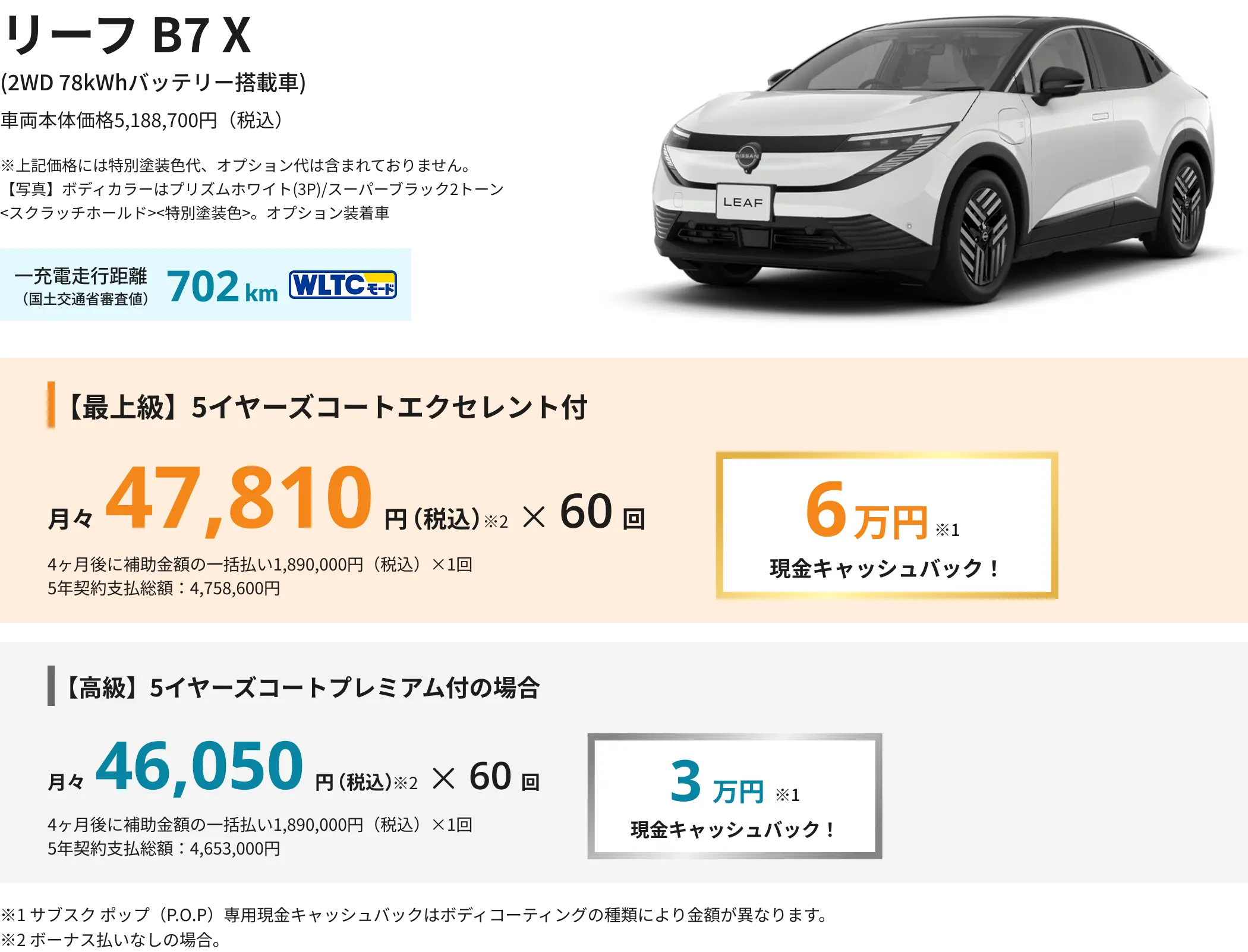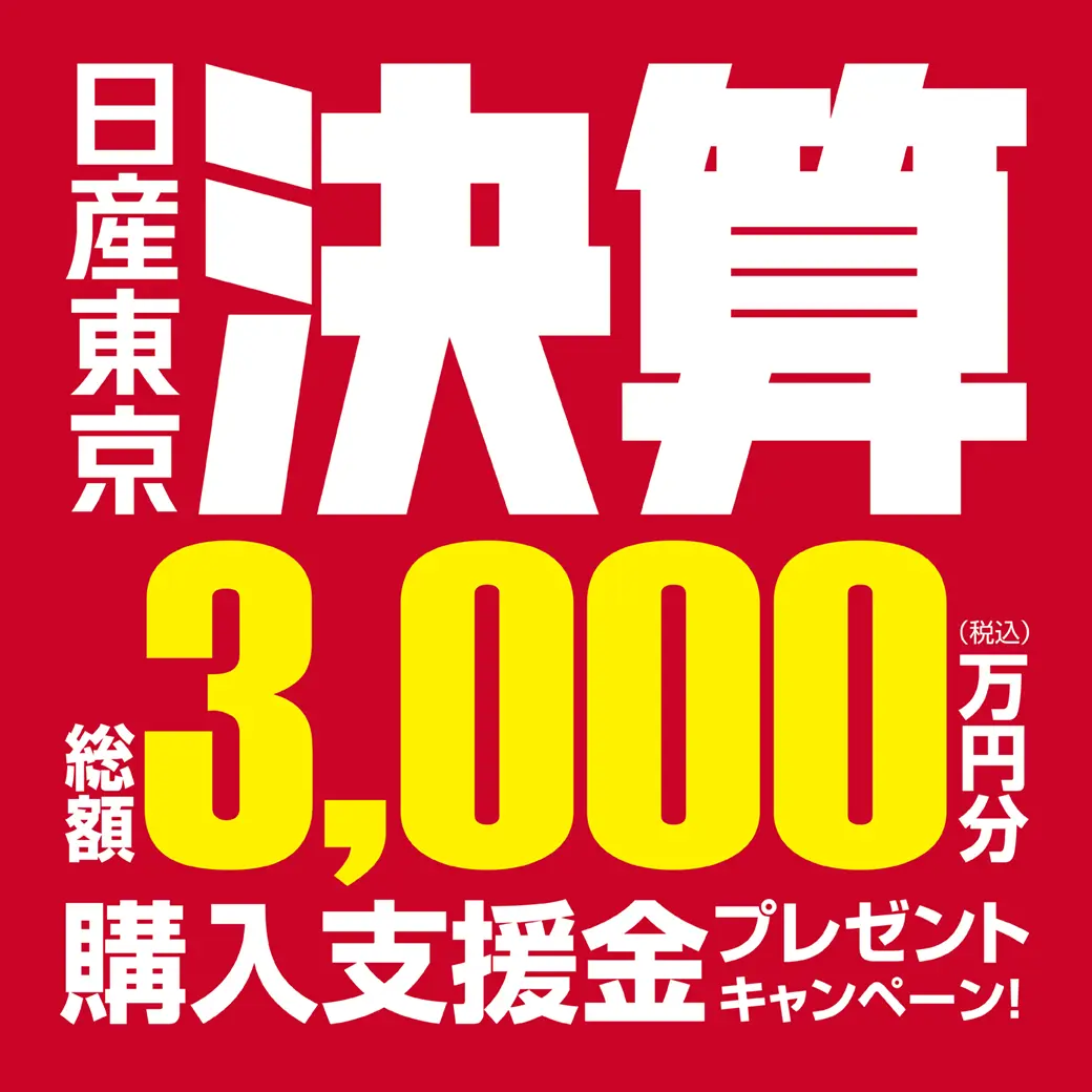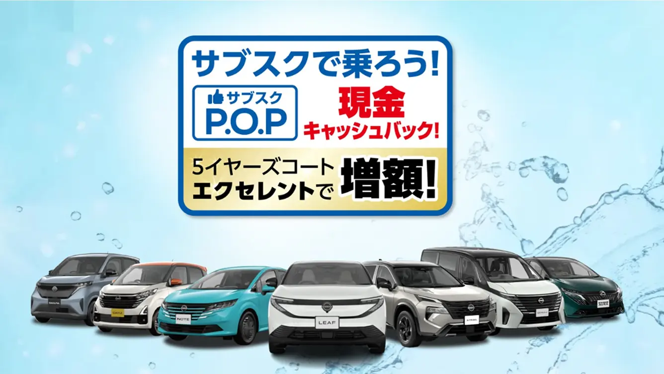 ■日産東京クルマのサブスク ポップ(P.O.P)の月額にはプランに記載されている特別装備以外のオプションと特別塗装色代は含まれておりません。●ボーナス併用払いプランもご用意しております。●表示している価格には消費税が含まれております。●お申し込みはいただけるのは個人のお客さまのみとなります。法人・個人事業主のお客さまはご利用いただけません。●P.O.Pは(株)エース・オートリースのリース(賃貸)商品です。●契約年数は5年契約(3年後以降乗りかえ特約付き)7年契約(4年後以降乗りかえ特約付き)プランより、また契約走行距離500km/1,000km/月よりお選びいただけます。一部車種により条件が異なります。●ご契約には審査が必要です。審査の結果お受けできない場合がございますので、予めご了承ください。新車乗りかえは、その際に車両状態が契約時に定められた条件を満たしている車両である必要がございます。詳しくはカーライフアドバイザーまでお問い合わせください。